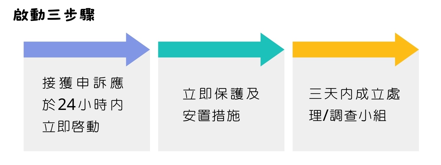 申訴處理流程,應把握關鍵三階段 : 啟動、調查、結論。