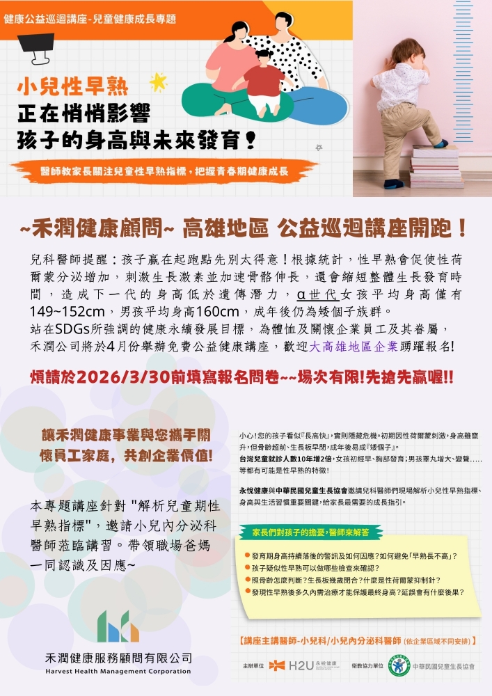 心血管疾病宣導(三高慢性病概述與防範)、五癌篩檢宣導(原理與實務)、隱形殺手代謝症候群(減重)、基因檢測精準醫療(未來致病風險指數)、腦部健康(自律神經、腦中風預防及復健)、疫情時代、內分泌失調(健康風險與治療方式)