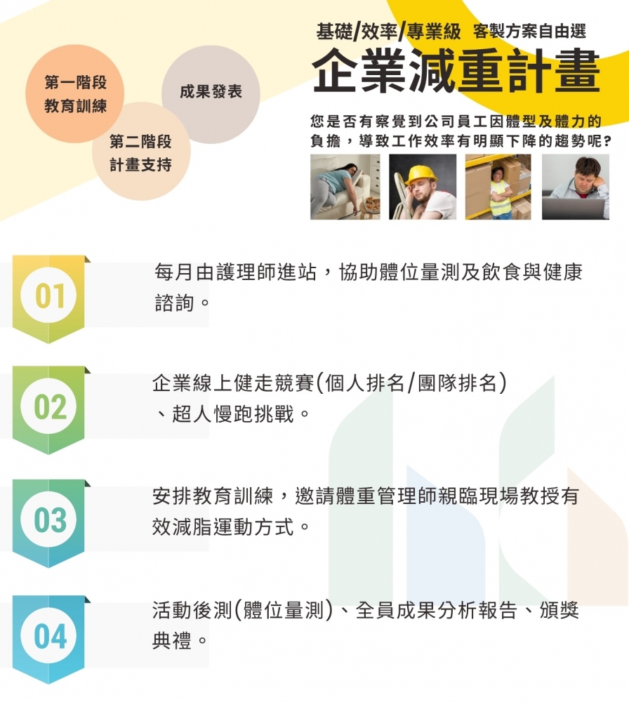 透過舉辦企業減重計畫,除了照顧員工健康,更能提升員工作業效率,熱絡企業內部文化。